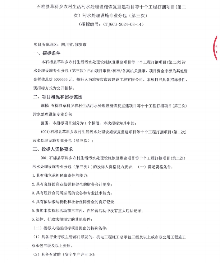 石棉縣草科鄉(xiāng)農(nóng)村生活污水處理設(shè)施恢復重建項目等十個工程打捆項目(第二次)污水處理設(shè)施專業(yè)分包(第三次)公告