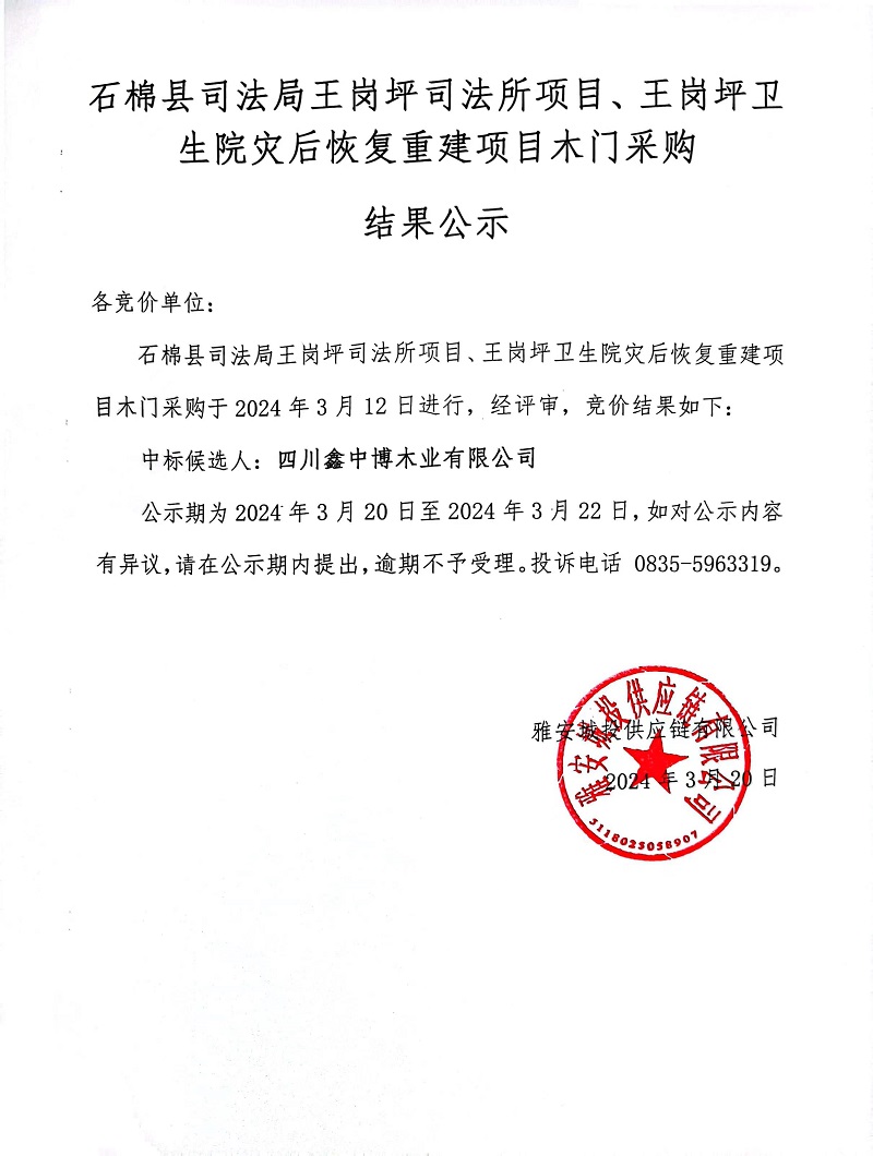 石棉縣司法局王崗坪司法所項(xiàng)目、王崗坪衛(wèi)生院災(zāi)后恢復(fù)重建項(xiàng)目木門采購(gòu)結(jié)果公示