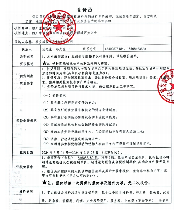 雅州壹號(hào)院鋁單板材料采購(gòu)競(jìng)價(jià)公告