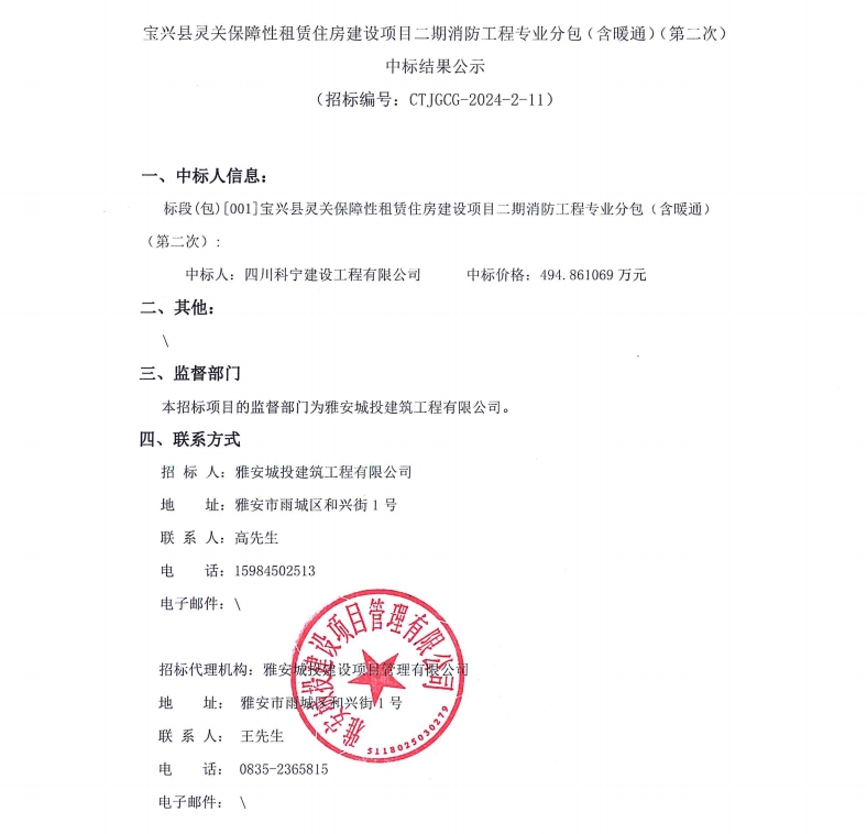 寶興縣靈關(guān)保障性租賃住房建設項目二期消防工程專業(yè)分包(含暖通)(第二次)中標結(jié)果公示