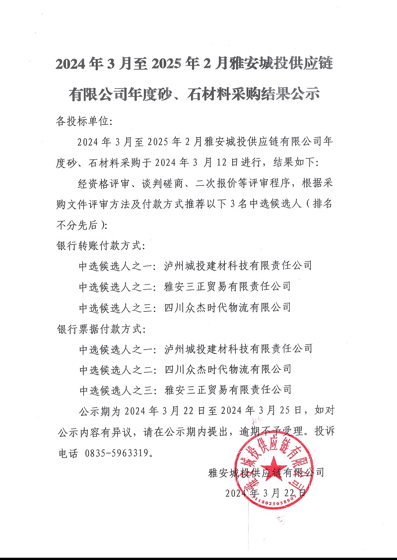 2024年3月至2025年2月雅安城投供應(yīng)鏈有限公司年度砂、石材料采購結(jié)果公示