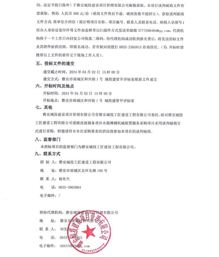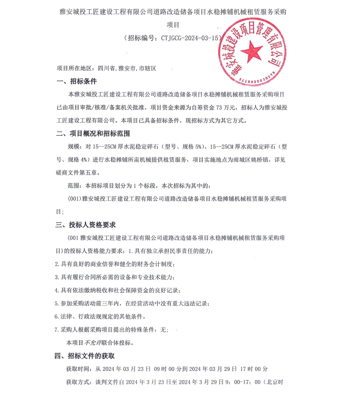 雅安城投工匠建設(shè)工程有限公司道路改造儲備項目水穩(wěn)攤鋪機械租賃服務(wù)采購項目公告