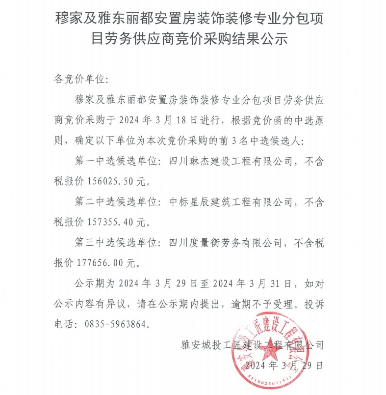 穆家及雅東麗都安置房裝飾裝修專業(yè)分包項目勞務(wù)供應(yīng)商采購競價采購結(jié)果公示