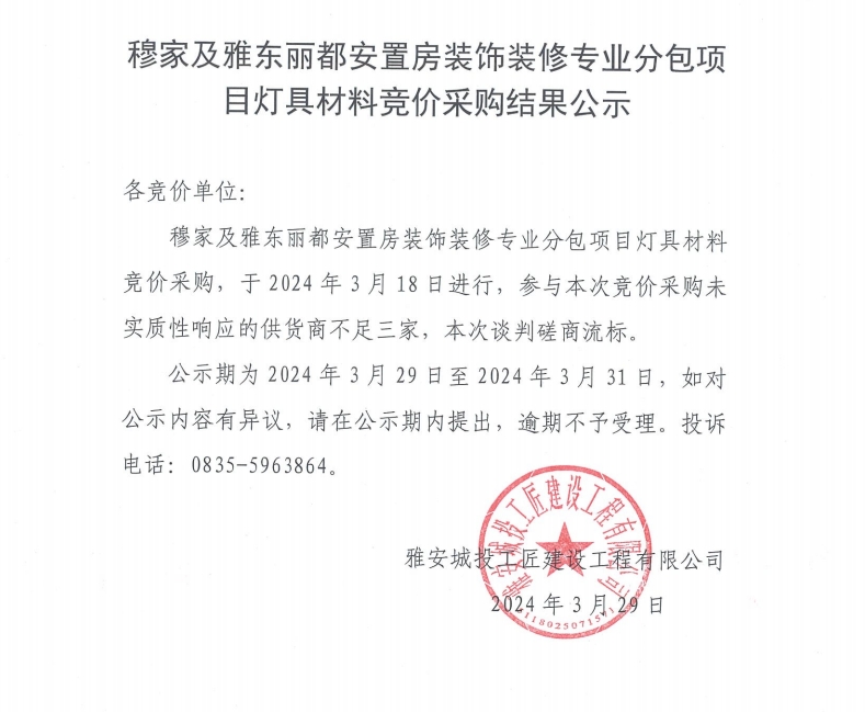 穆家及雅東麗都安置房裝飾裝修專業(yè)分包項(xiàng)目燈具材料采購競價結(jié)果公示