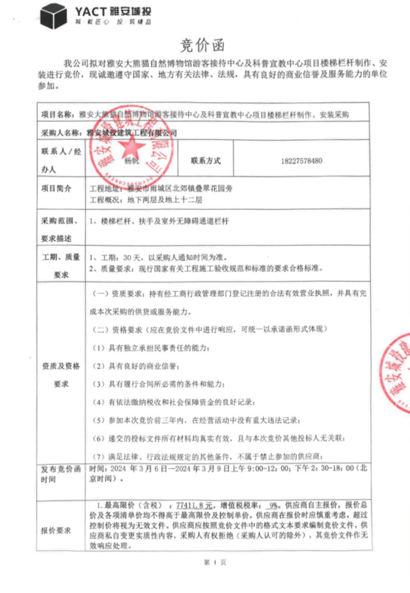 雅安大熊貓自然博物館游客接待中心及科普宣教中心項(xiàng)目樓梯欄桿制作、安裝采購(gòu)競(jìng)價(jià)公告