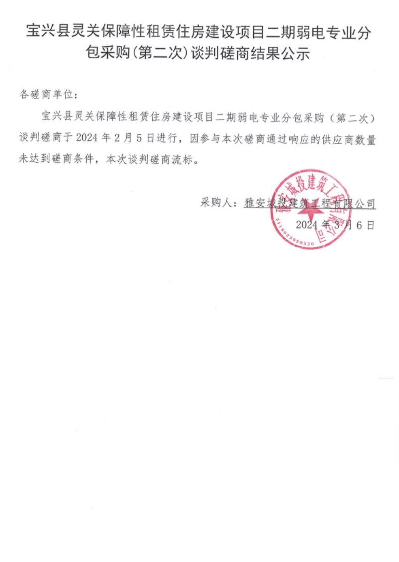 寶興縣靈關(guān)鎮(zhèn)保障性租賃住房建設(shè)項目二期弱電專業(yè)分包采購(第二次)談判磋商結(jié)果公示