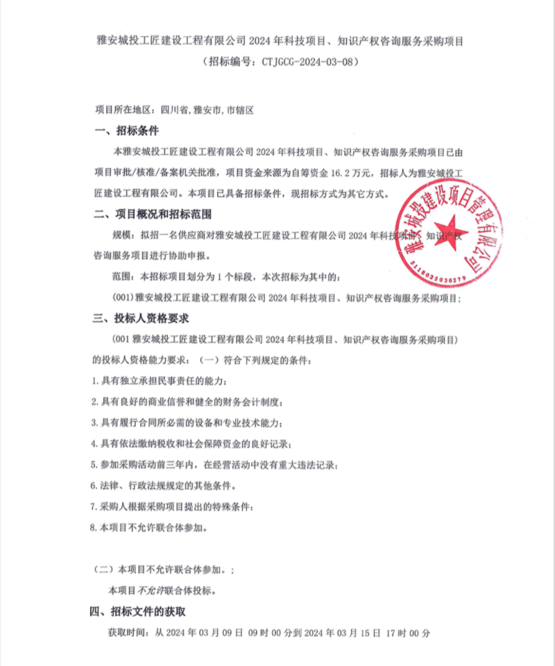 雅安城投工匠建設工程有限公司2024年科技項目、知識產(chǎn)權咨詢服務采購項目