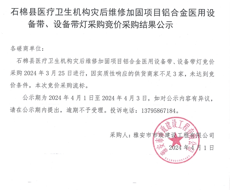 石棉縣醫(yī)療衛(wèi)生機(jī)構(gòu)災(zāi)后維修加固項目鋁合金醫(yī)用設(shè)備帶、設(shè)備帶燈采購競價采購結(jié)果公示