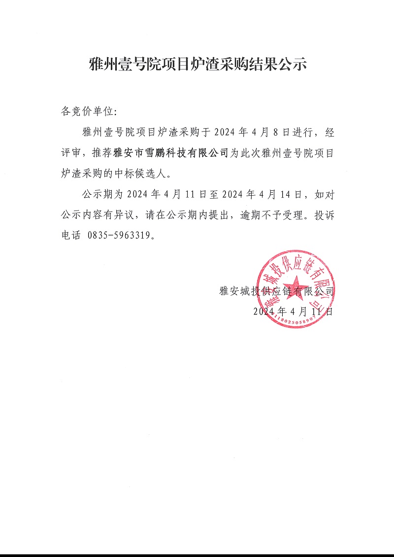 雅州壹號院項目爐渣采購結(jié)果公示