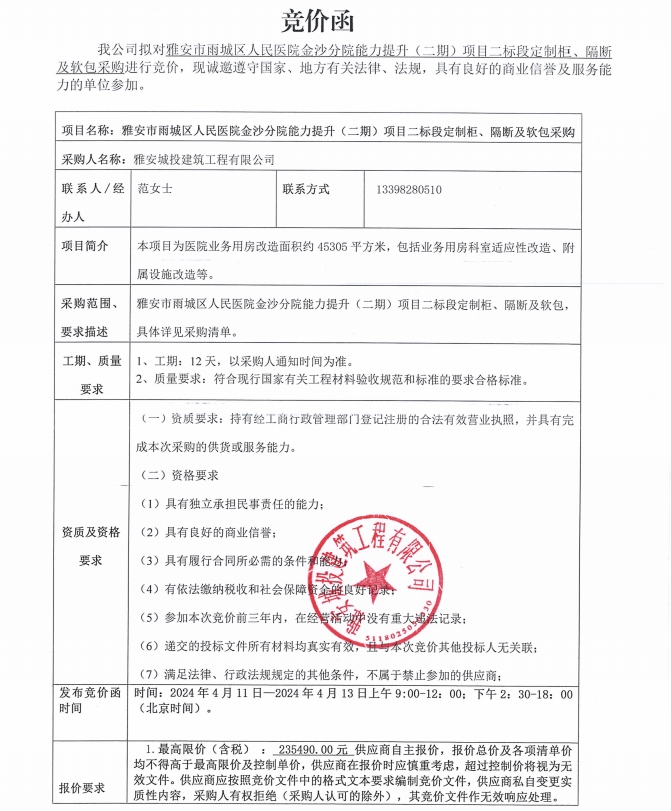 雅安市雨城人民醫(yī)院金沙分院能力提升(二期)項(xiàng)目二標(biāo)段定制柜、隔斷及軟包采購競價(jià)公告