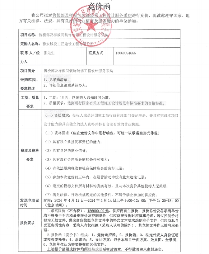 售樓部及樣板間裝飾裝修工程設(shè)計(jì)服務(wù)采購(gòu)競(jìng)價(jià)公告