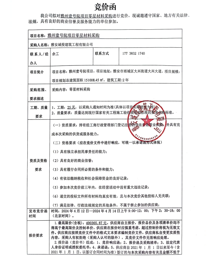 雅州壹號(hào)院項(xiàng)目零星材料采購(gòu)競(jìng)價(jià)公告