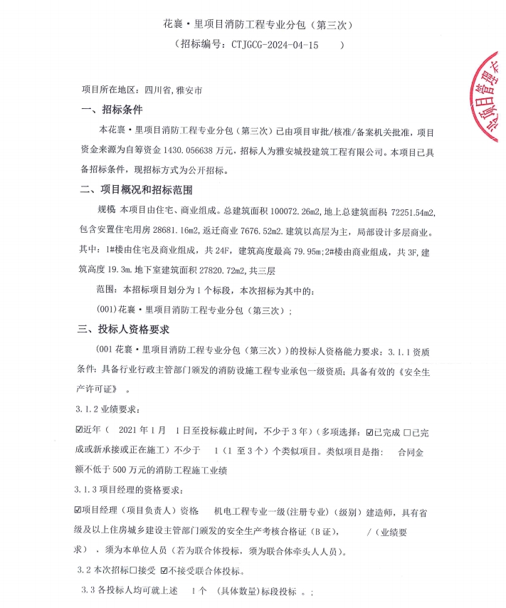 花襄·里項目消防工程專業(yè)分包(第三次)公告