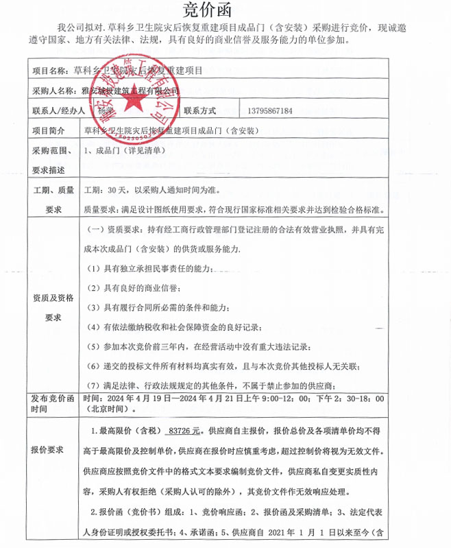 草科鄉(xiāng)衛(wèi)生院災(zāi)后恢復(fù)重建項(xiàng)目成品門(含安裝)采購競價(jià)公告