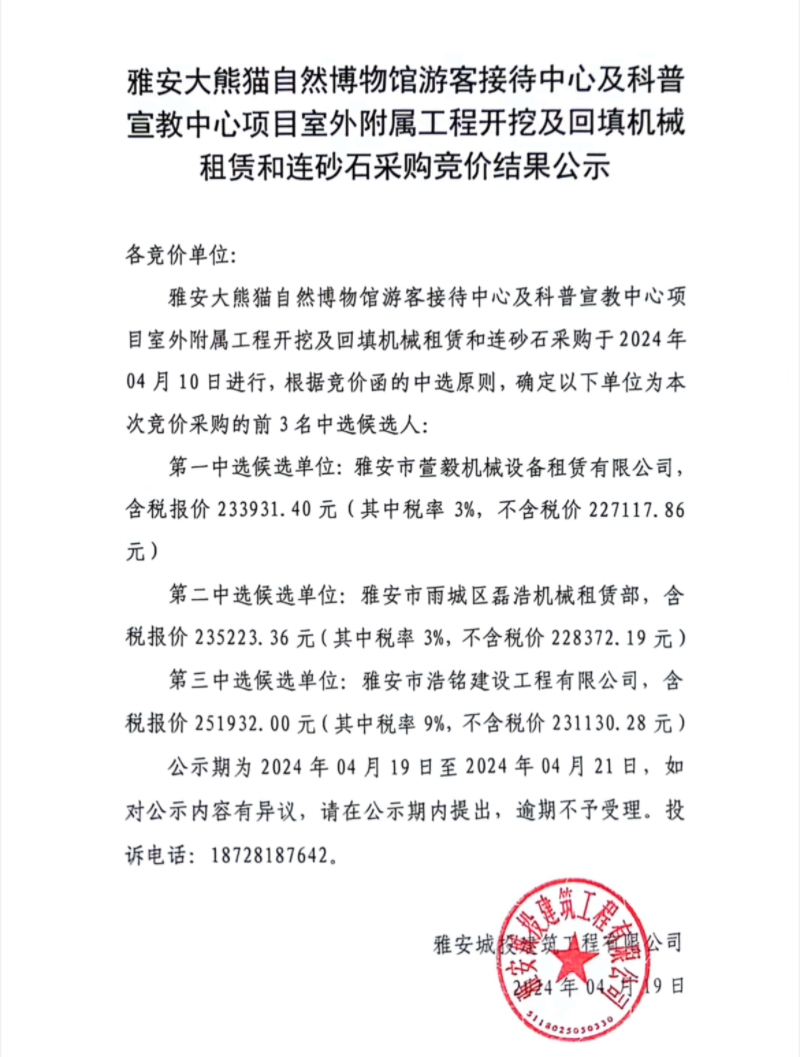雅安大熊貓自然博物館游客接待中心及科普宣教中心項(xiàng)目室外附屬工程開(kāi)挖及回填機(jī)械租賃和連砂石采購(gòu)競(jìng)價(jià)結(jié)果公示