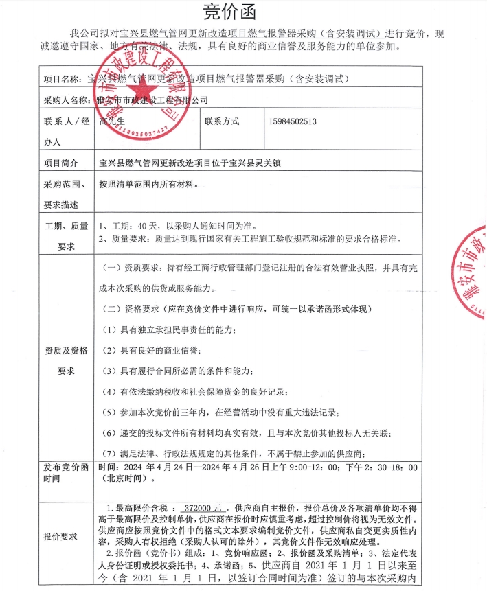 寶興縣燃氣管網(wǎng)更新改造項目燃氣報警器采購(含安裝調(diào)試)競價公告