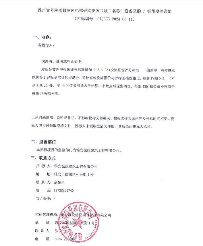 雅州壹號院項目室內(nèi)電梯采購安裝(項目名稱)設(shè)備采購/標段澄清通知