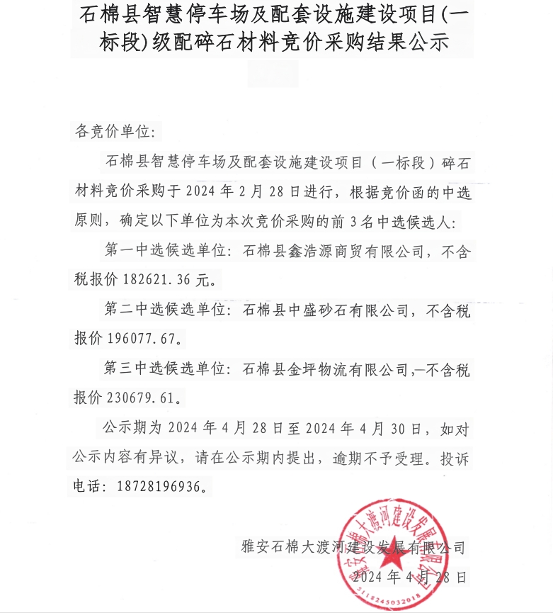 石棉縣智慧停車(chē)場(chǎng)及配套設(shè)施建設(shè)項(xiàng)目(一標(biāo)段)級(jí)配碎石材料競(jìng)價(jià)采購(gòu)結(jié)果公示