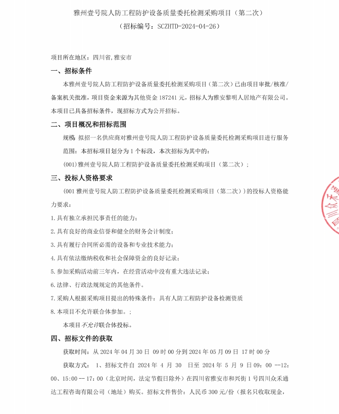 雅州壹號院人防工程防護設備質(zhì)量委托檢測采購項目(第二次)公告