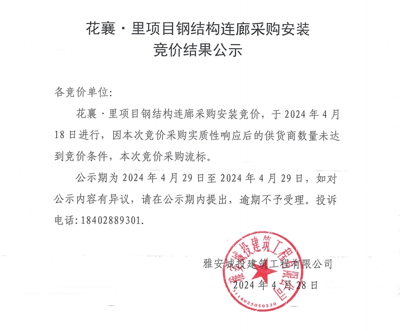 花襄·里項(xiàng)目鋼結(jié)構(gòu)連廊采購安裝競價(jià)結(jié)果公示