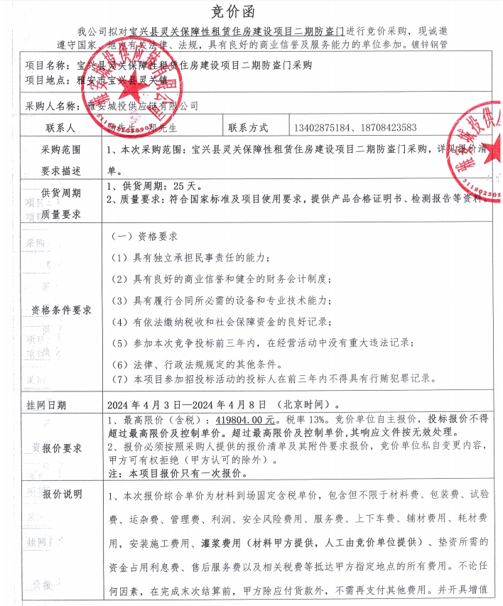 寶興縣靈關保障性租賃住房建設項目二期防盜門采購競價公告
