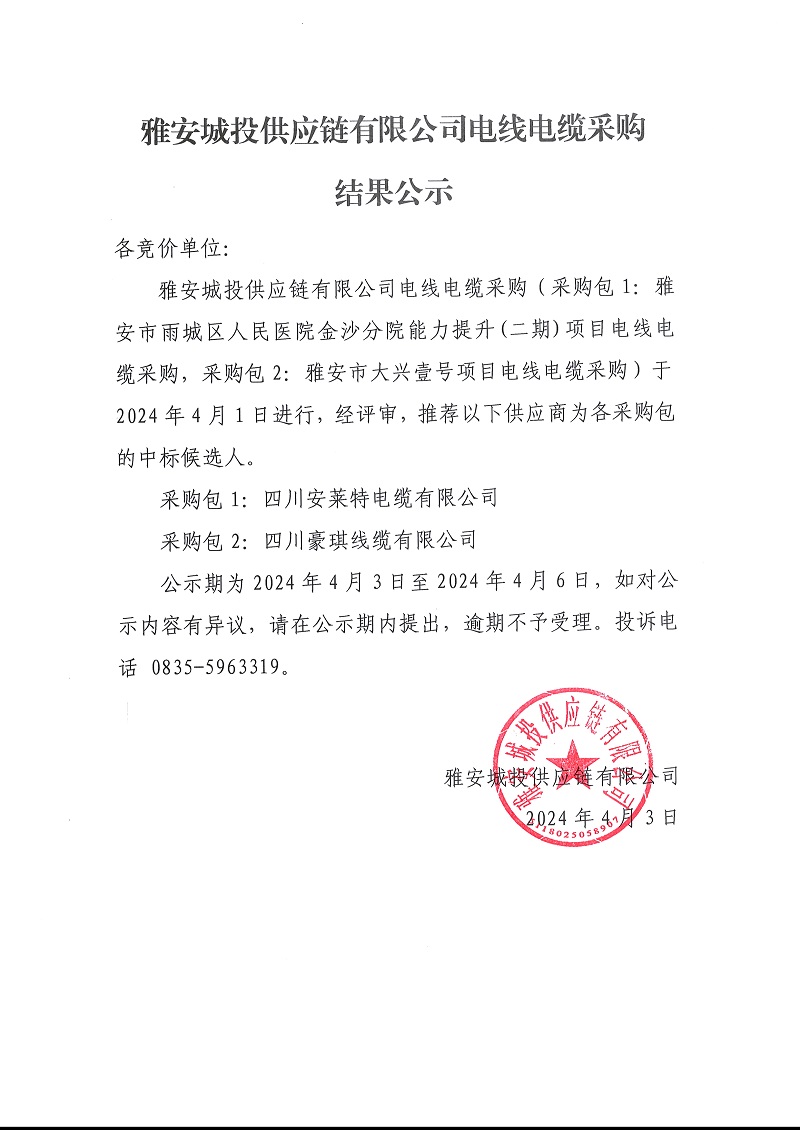 雅安城投供應(yīng)鏈有限公司電線電纜采購(gòu)結(jié)果公示