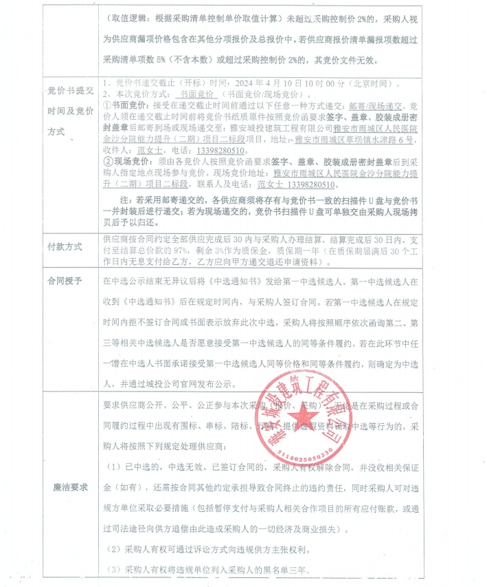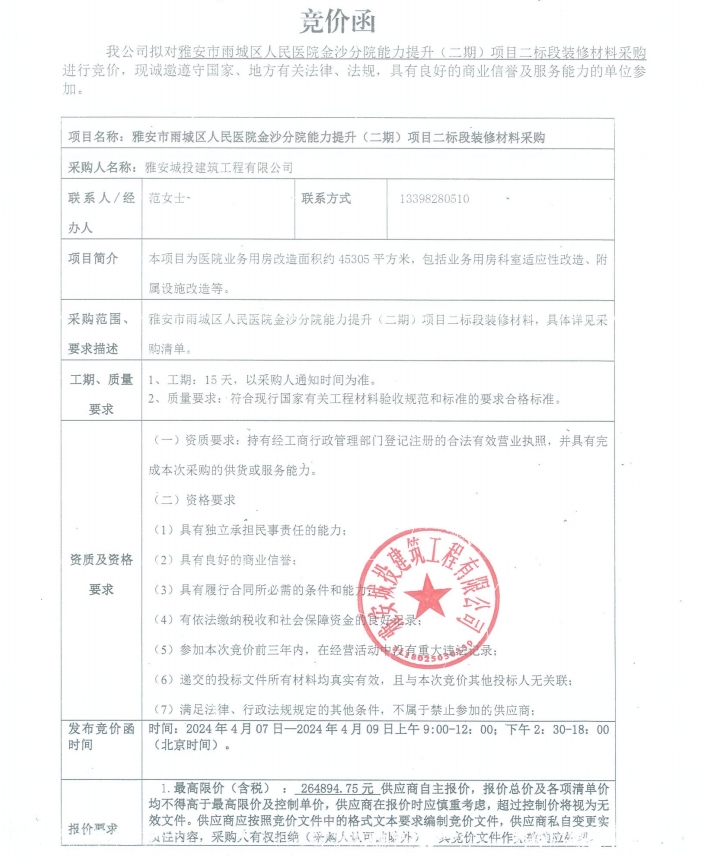 雅安市雨城區(qū)人民醫(yī)院金沙分院能力提升(二期)項(xiàng)目二標(biāo)段裝修材料采購(gòu)競(jìng)價(jià)公告