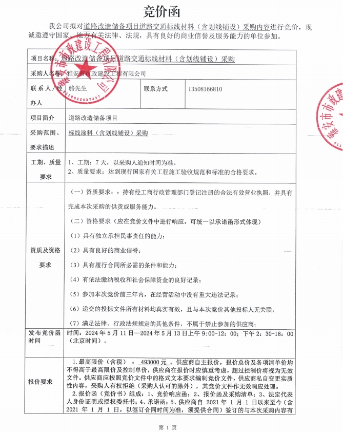 道路改造儲(chǔ)備項(xiàng)目道路交通標(biāo)線材料(含劃線鋪設(shè))采購競價(jià)公告