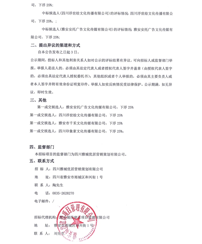 2024年四川雅城優(yōu)居營銷策劃有限公司年度廣告制作服務項目中標候選人公示