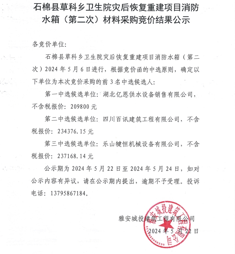石棉縣草科鄉(xiāng)衛(wèi)生院災(zāi)后恢復(fù)重建項(xiàng)目消防水箱(第二次)材料采購(gòu)競(jìng)價(jià)結(jié)果公示