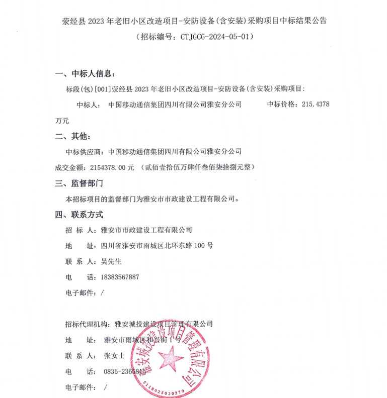滎經(jīng)縣2023年老舊小區(qū)改造項(xiàng)目-安防設(shè)備(含安裝)采購(gòu)項(xiàng)目中標(biāo)結(jié)果公告