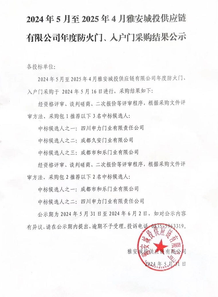 2024年5月至2025年4月雅安城投供應鏈有限公司年度防火門、入戶門采購結(jié)果公示