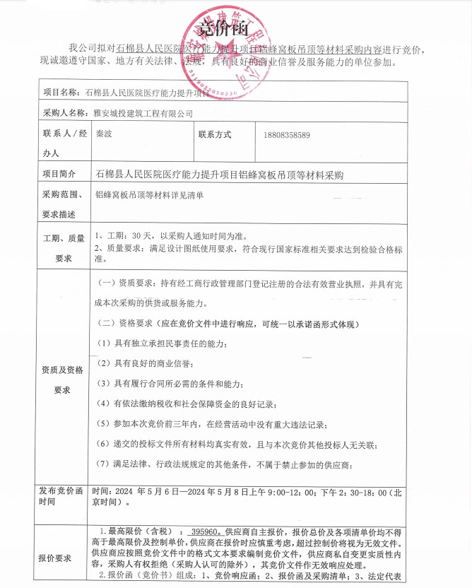 石棉縣人民醫(yī)院醫(yī)療能力提升項(xiàng)目鋁蜂窩板吊頂?shù)炔牧喜少弮?nèi)容競價公告
