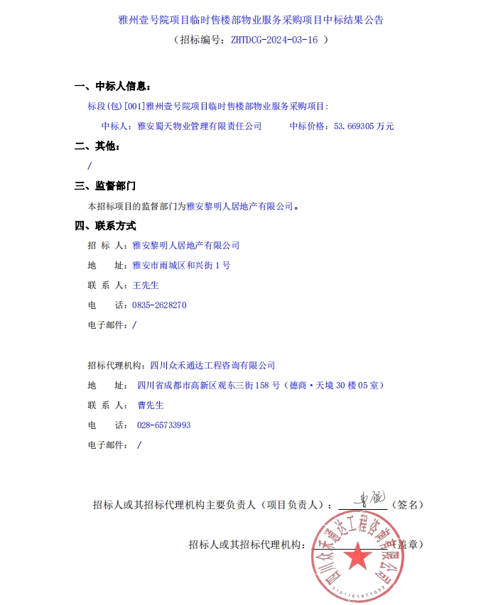 雅州壹號院項(xiàng)目臨時售樓部物業(yè)服務(wù)采購項(xiàng)目中標(biāo)結(jié)果公告