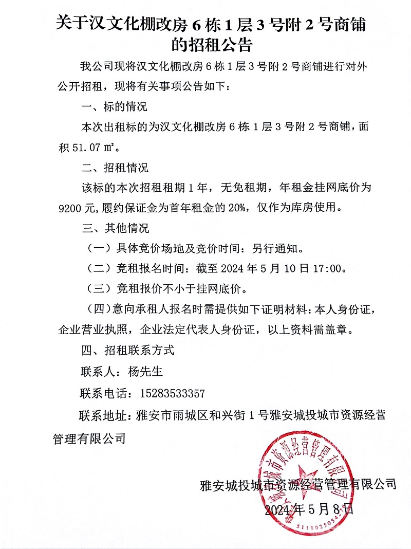 關于漢文化棚改房6棟1層3號附2號商鋪的招租公告