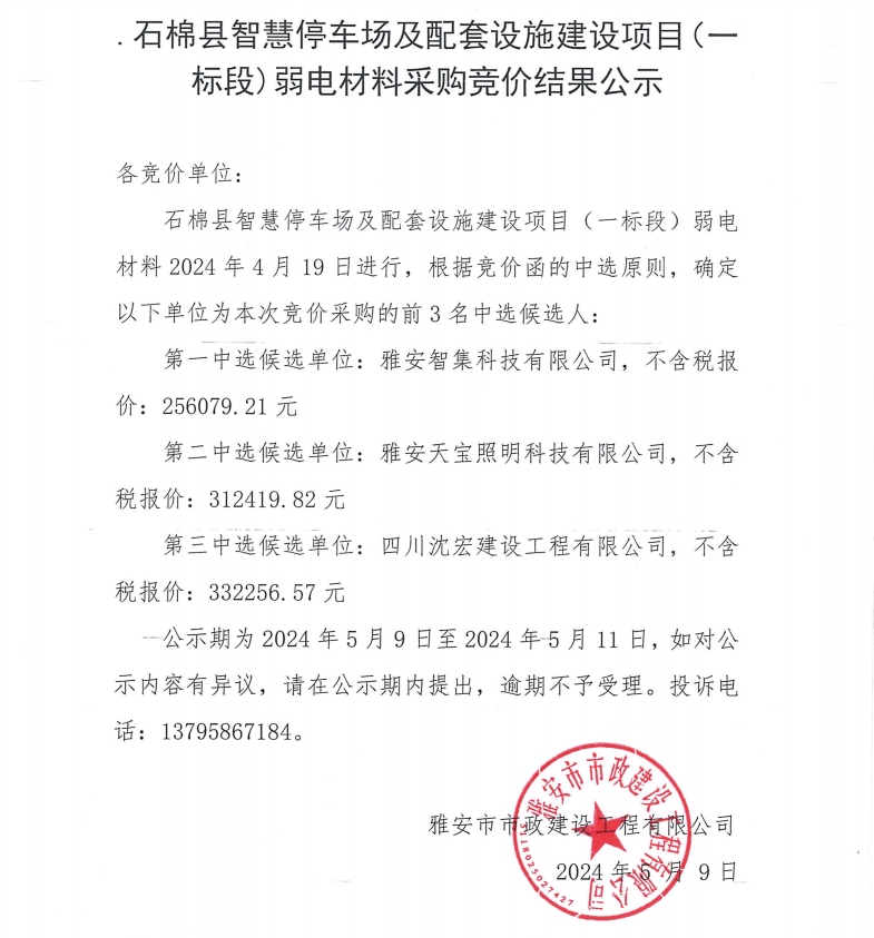 石棉縣智慧停車場及配套設(shè)備建設(shè)項目(一標段)弱電材料采購競價結(jié)果公示