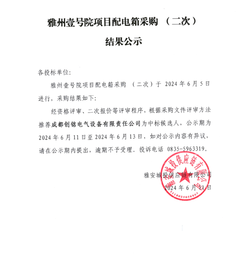 雅州壹號院項(xiàng)目配電箱采購(二次)結(jié)果公示