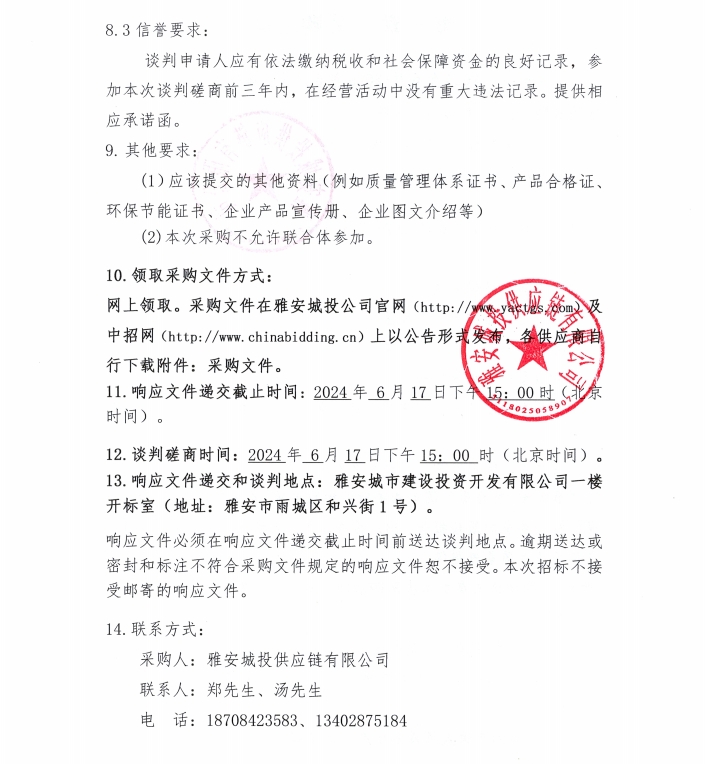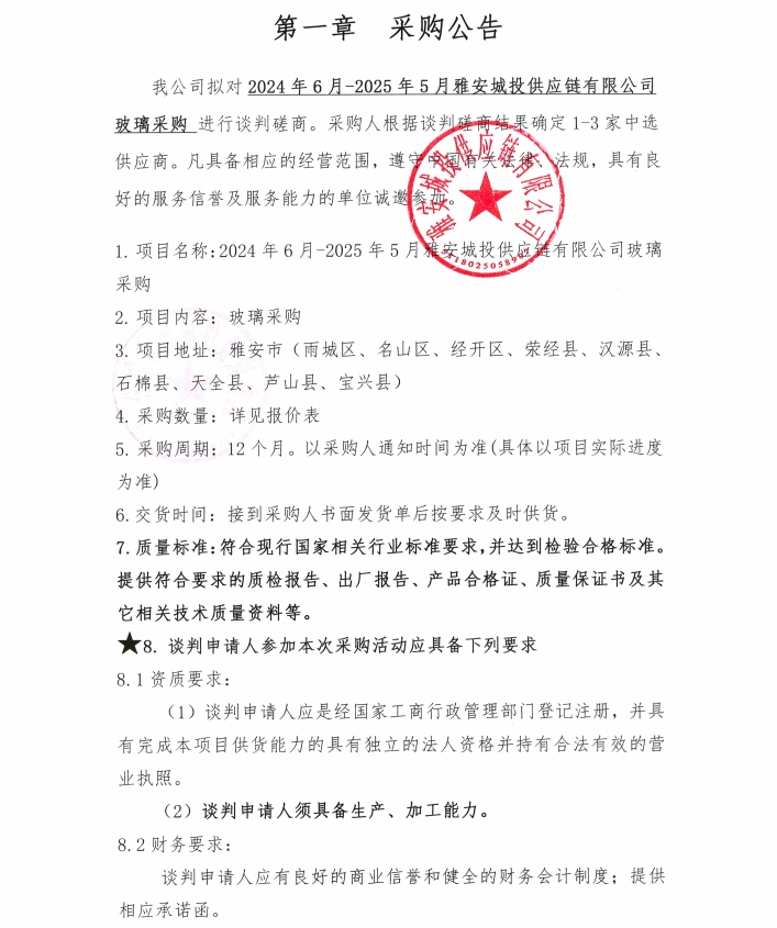 2024年6月-2025年5月雅安城投供應鏈有限公司玻璃采購公告
