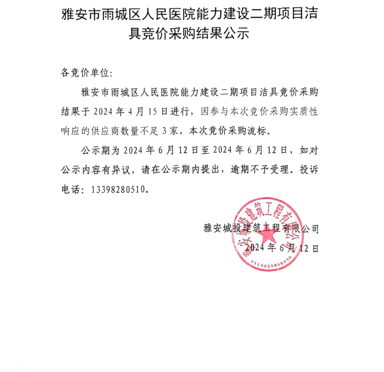 雅安市雨城人民醫(yī)院能力建設(shè)二期項目潔具競價采購結(jié)果公示