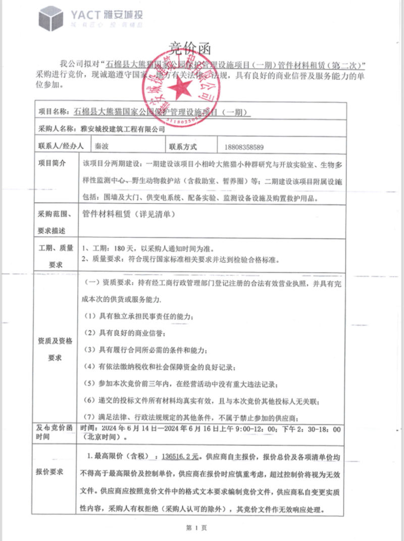 石棉縣大熊貓國家公園保護(hù)管理設(shè)施項(xiàng)目(一期)管件材料租賃(第二次)競價(jià)公告