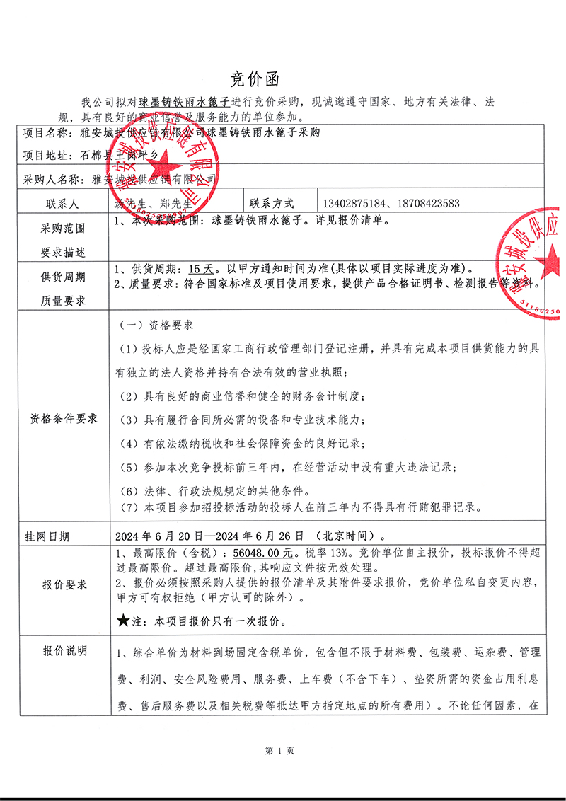 球墨鑄鐵雨水篦子競(jìng)價(jià)采購(gòu)函