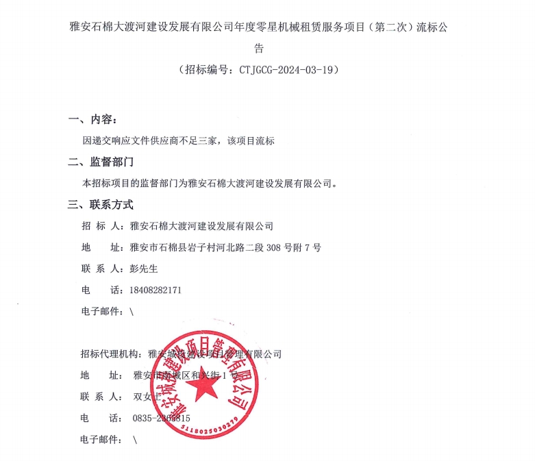 雅安石棉大渡河建設(shè)發(fā)展有限公司年度零星機(jī)械租賃服務(wù)項(xiàng)目(第二次)流標(biāo)公告