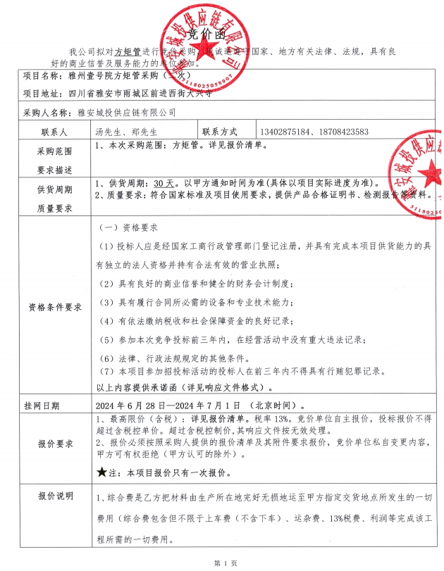 附件1:競(jìng)價(jià)函--雅州壹號(hào)院方矩管采購(二次)