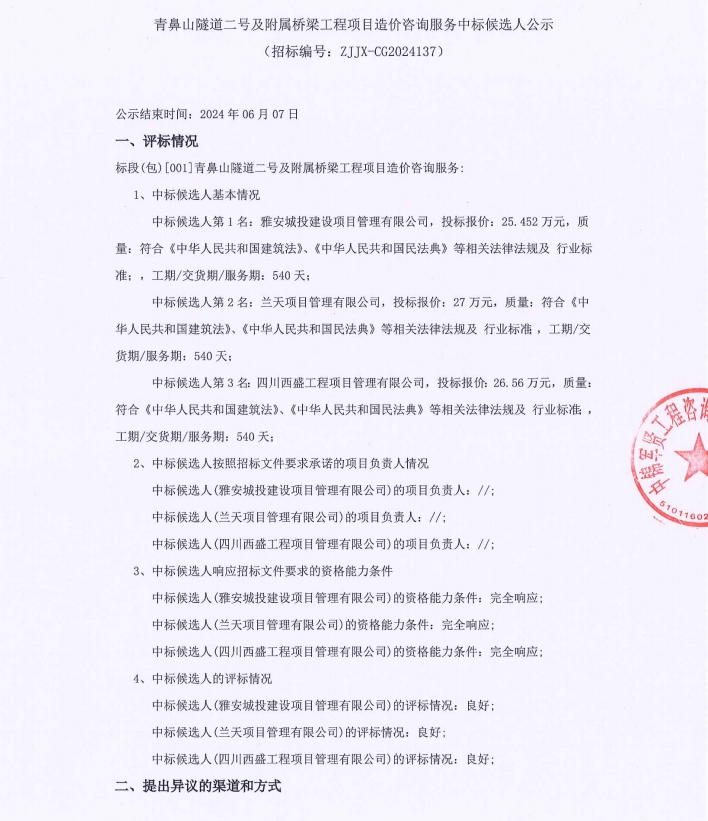 青鼻山隧道二號(hào)及附屬橋梁工程項(xiàng)目造價(jià)咨詢服務(wù)中標(biāo)候選人公示