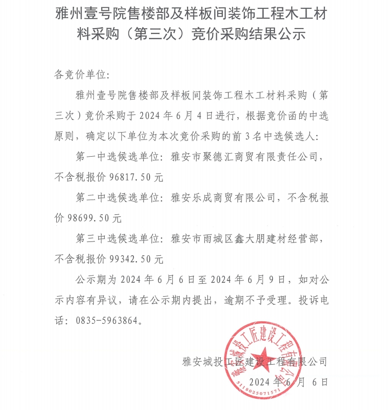 雅州壹號(hào)院售樓部及樣板間裝飾工程木工材料采購(第三次)競價(jià)采購結(jié)果公示