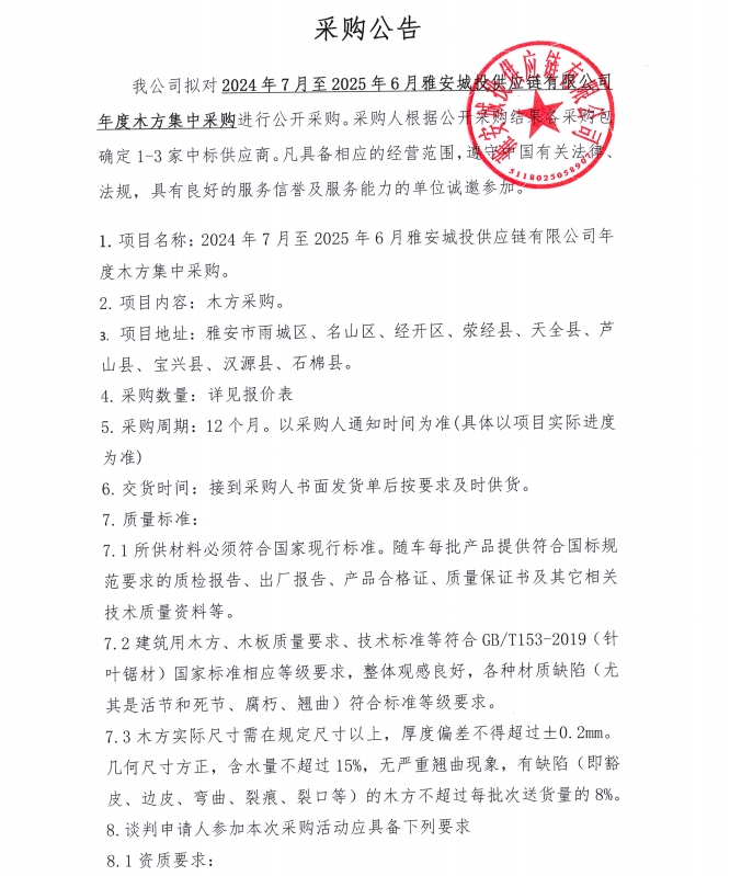 2024年7月至2025年6月雅安城投供應(yīng)鏈有限公司年度木方集中采購公告