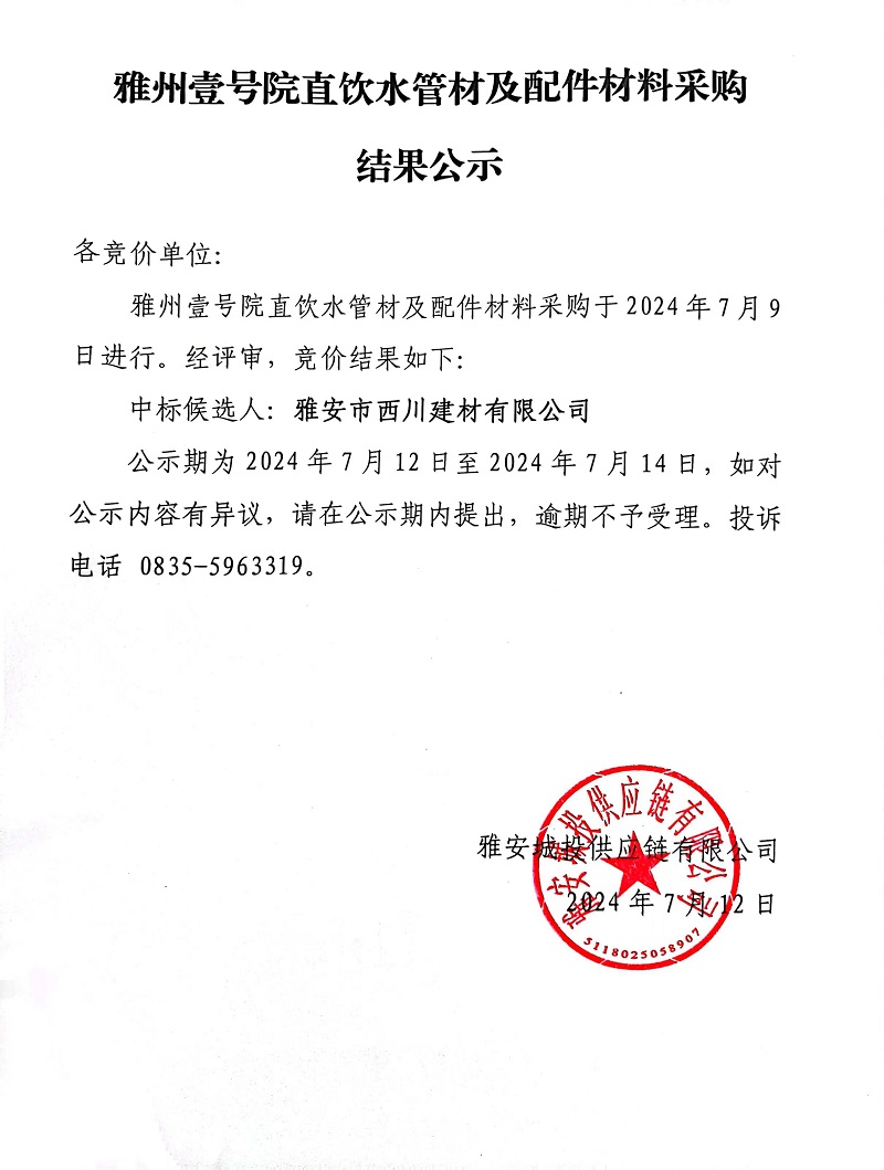 雅州壹號院直飲水管材及配件材料采購結(jié)果公示