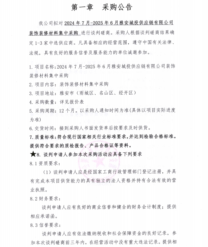 2024年7月-2025年6月雅安城投供應(yīng)鏈有限公司裝飾裝修材料集中采購(gòu)公告