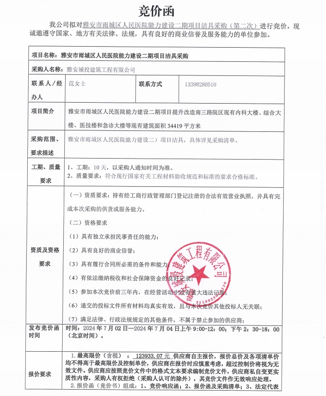 雅安市雨城區(qū)人民醫(yī)院能力建設(shè)二期項(xiàng)目潔具采購(第二次)競價公告