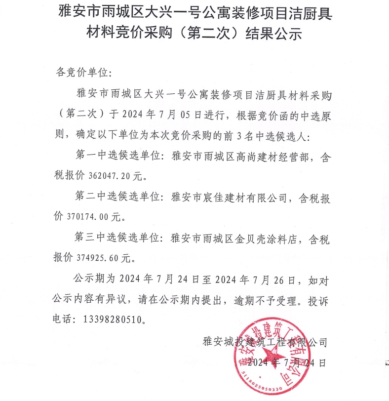 雅安市雨城區(qū)大興一號(hào)公寓裝修項(xiàng)目潔廚具材料競(jìng)價(jià)采購(第二次)結(jié)果公示
